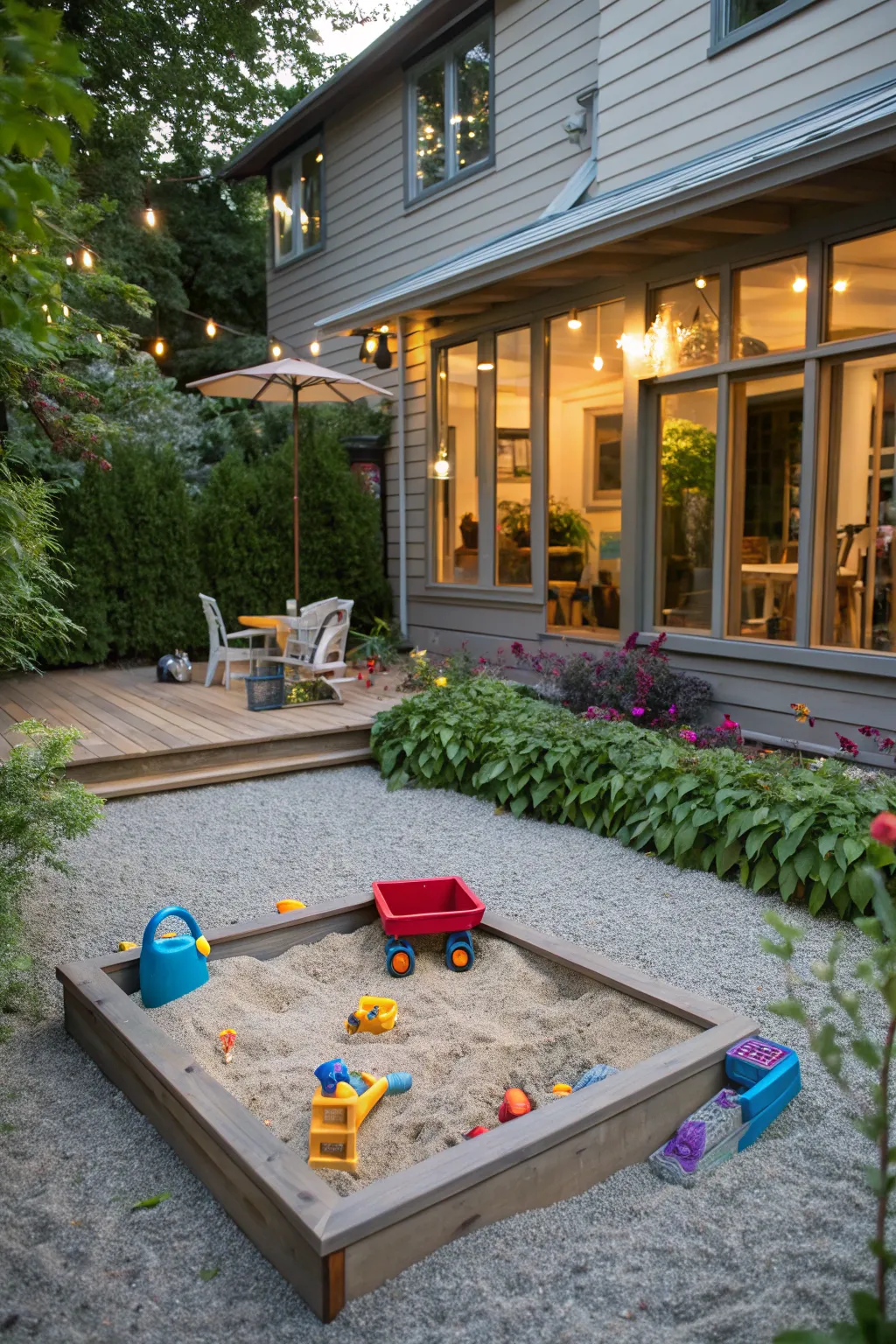 Allocate a part of your gravel patio for a youth zone, including a sandbox or play sets. It’s a lovely way to keep the little ones busy while you unwind.