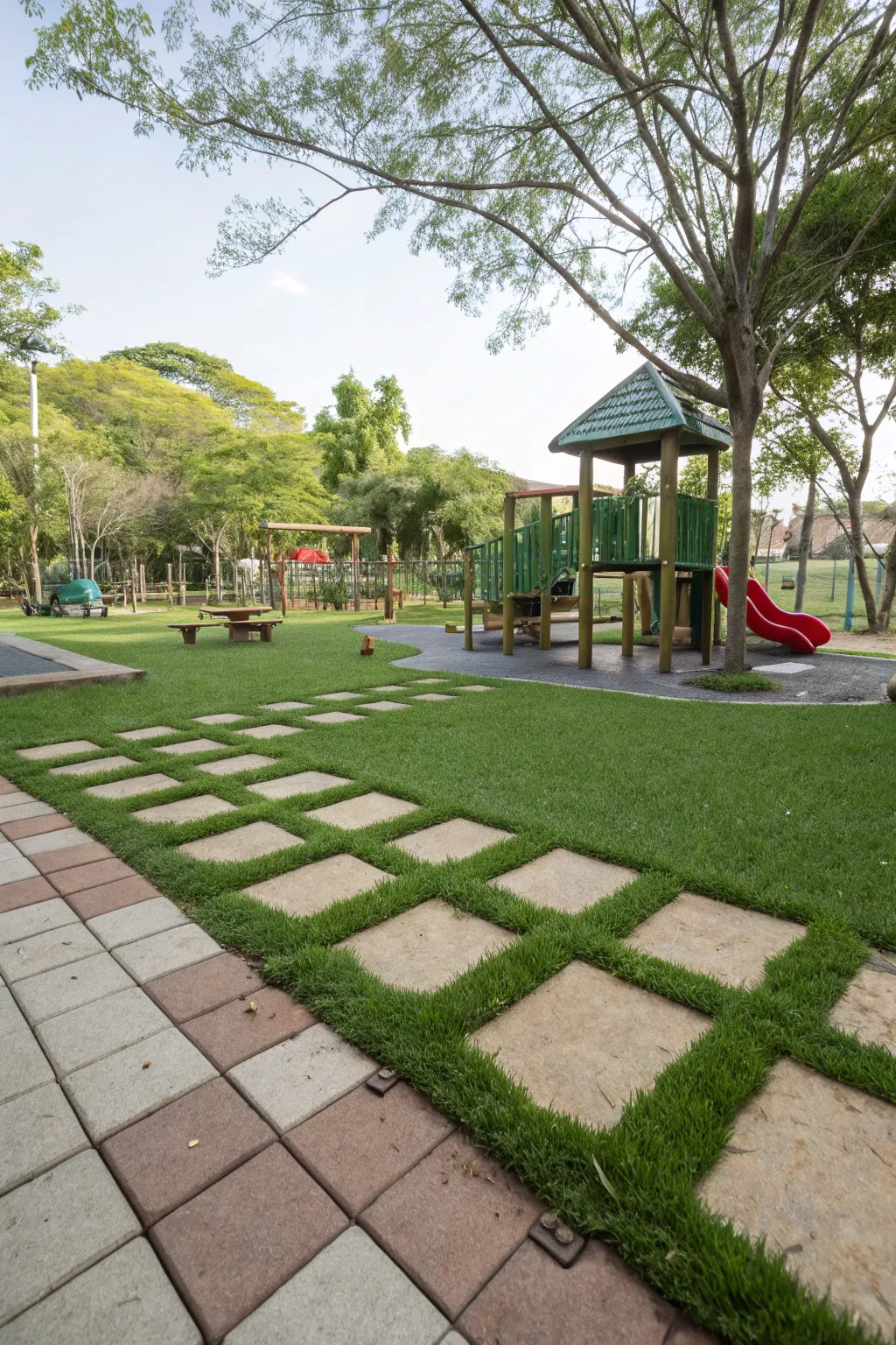 Stone walkways introduce a distinctive accent to playgrounds.