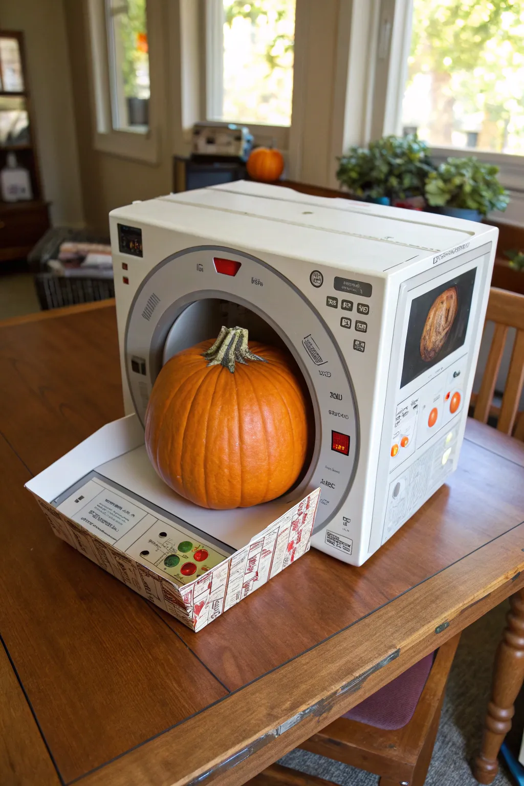 Construct a magnetic resonance imaging machine scene using a gourd by utilizing a painted box to resemble an MRI and setting the pumpkin as the “patient.” It’s an imaginative approach to emphasize medical imaging.