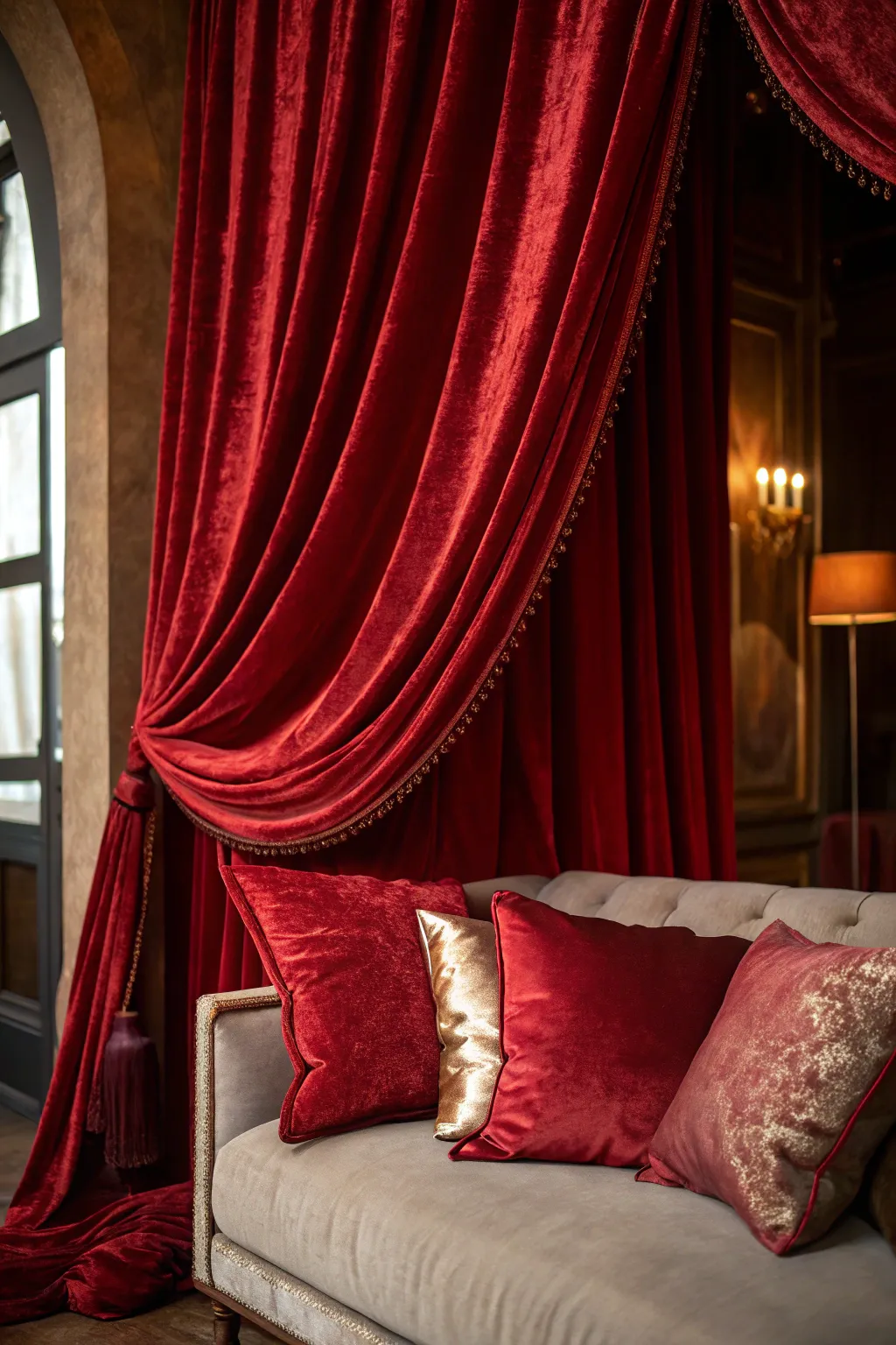 - Crimson Velvet Window Dressings: Introduce elegance to your area using these luxurious crimson velvet window dressings for a striking effect.
