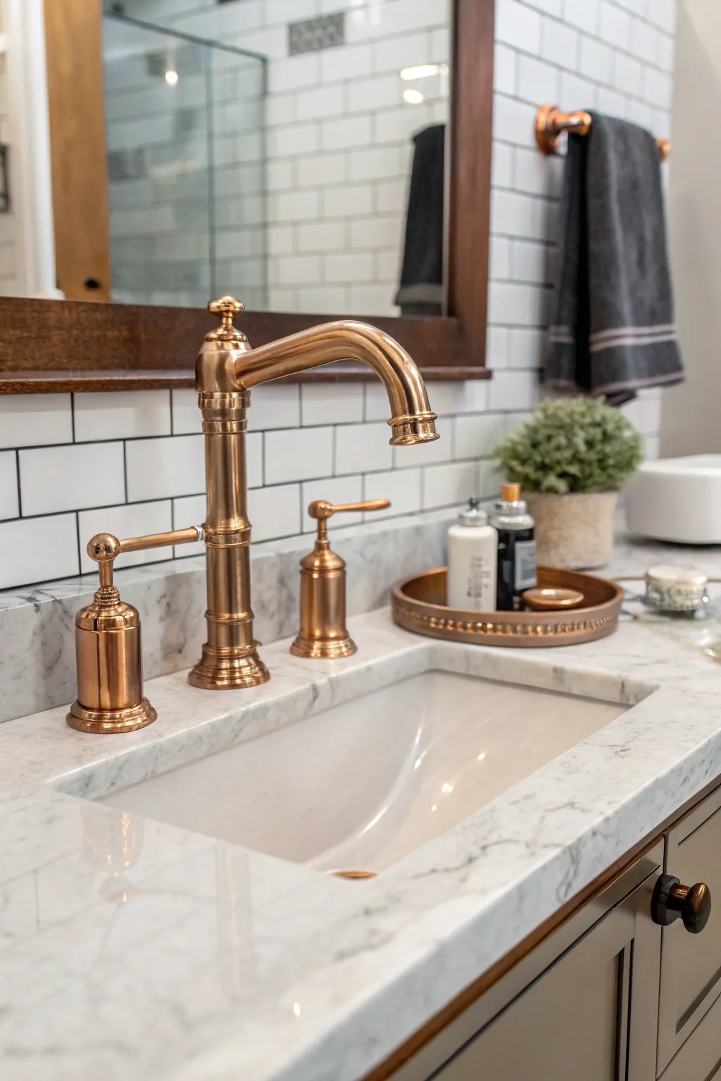 • Timeworn Copper Reflection: Unite your tap with a timeworn copper mirror, conjuring a unified and elegant bathroom aesthetic.