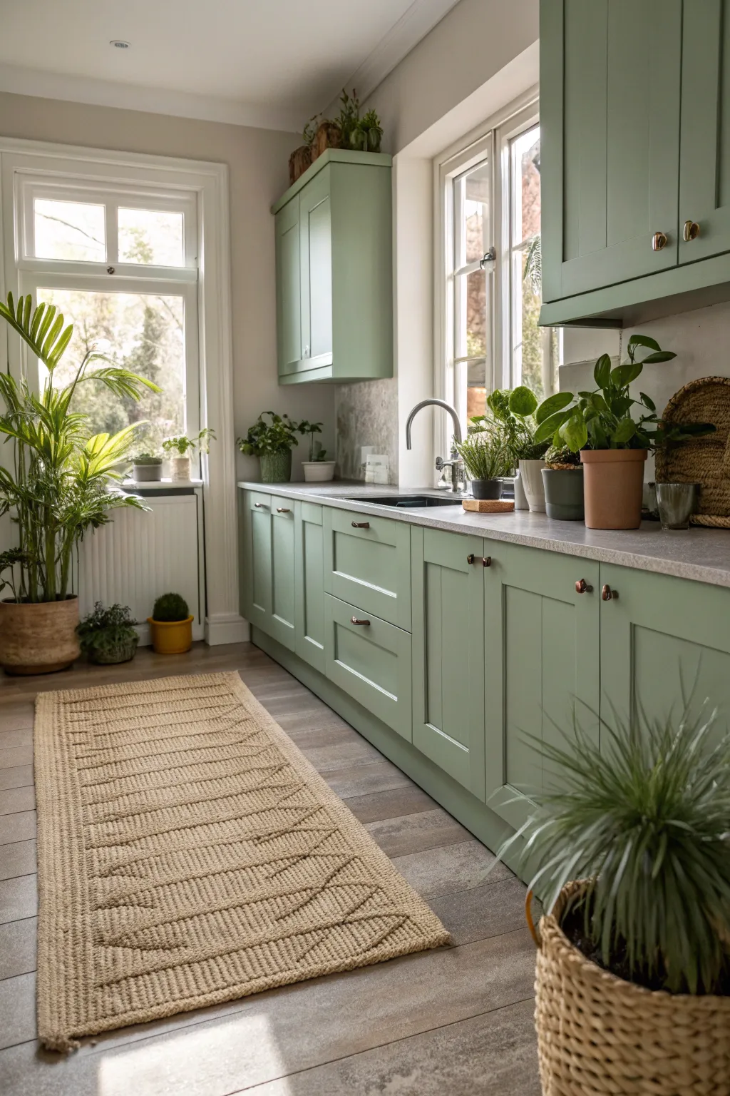 Incorporate textured features like rugs or plants to impart warmth and vitality to your sage green kitchen. I’ve witnessed how these touches transform a space into a welcoming getaway.