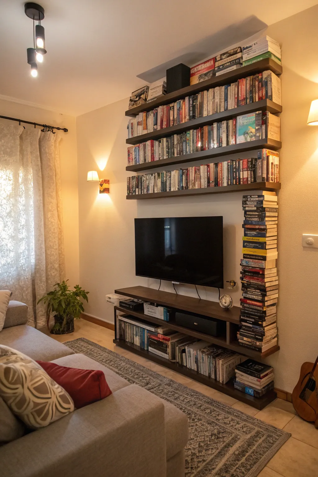 Amplify vertical space by arranging floating shelves above your TV, providing additional storage without overwhelming the area—ideal for housing books or DVDs.