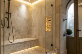For an element of luxury, consider marble accents that not only exude extravagance but also enduring sophistication. I frequently advocate for marble because of its capacity to enhance the entire bathroom’s visual appeal.