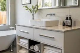 - Malleable Dressing-Table Reflector: Append adaptability and stylishness through the utilization of a tilted dressing-table reflector, which is uniquely suited for more diminutive bathing spaces.