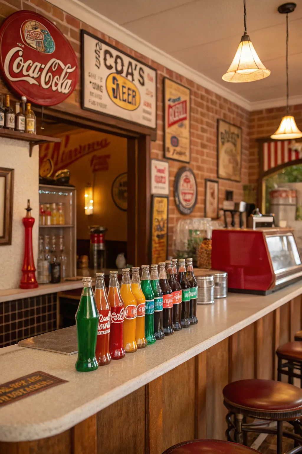 Design a classic soda counter featuring a variety of vibrant soda bottles and vintage signs. It’s a playful tribute to the past that visitors spanning all age ranges will appreciate.