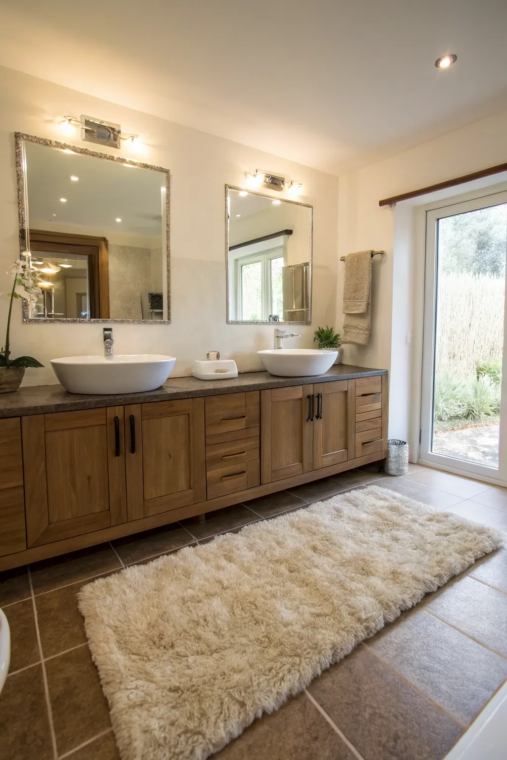 Incorporate warmth and comfort with a plush rug in front of your double sinks. I’ve discovered that a carefully selected rug can unite the entire space while adding a cozy touch.