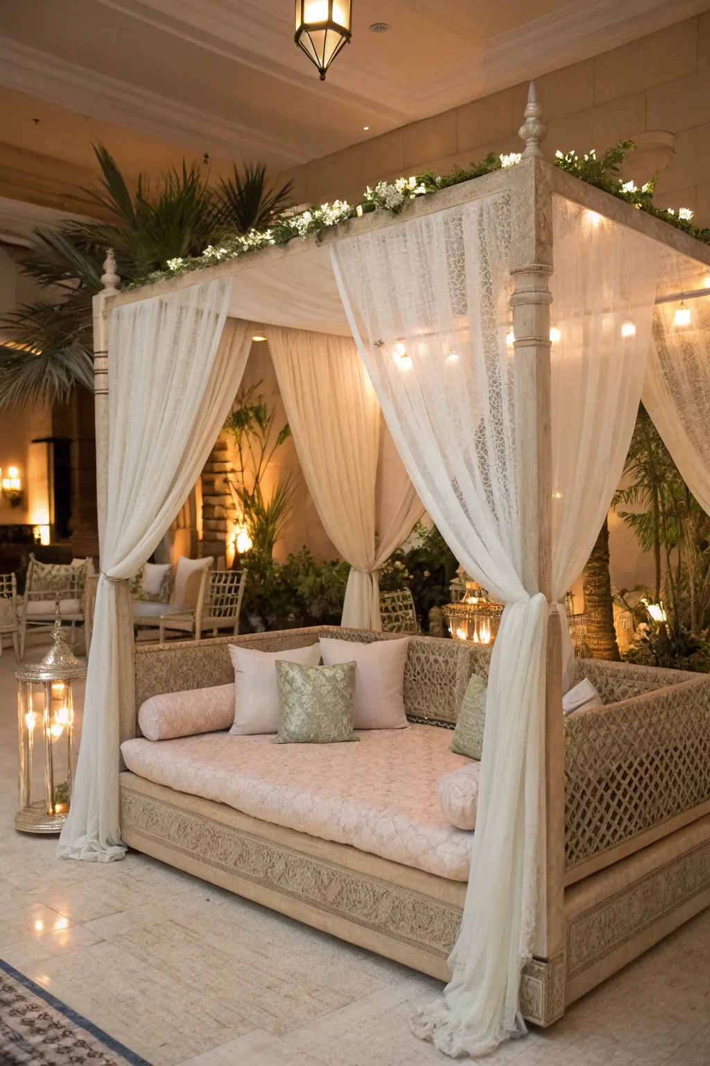 Include a canopy to your daybed for a dreamy, ethereal feeling. This design element, similar to peaceful getaways, can transform even the most basic spaces.