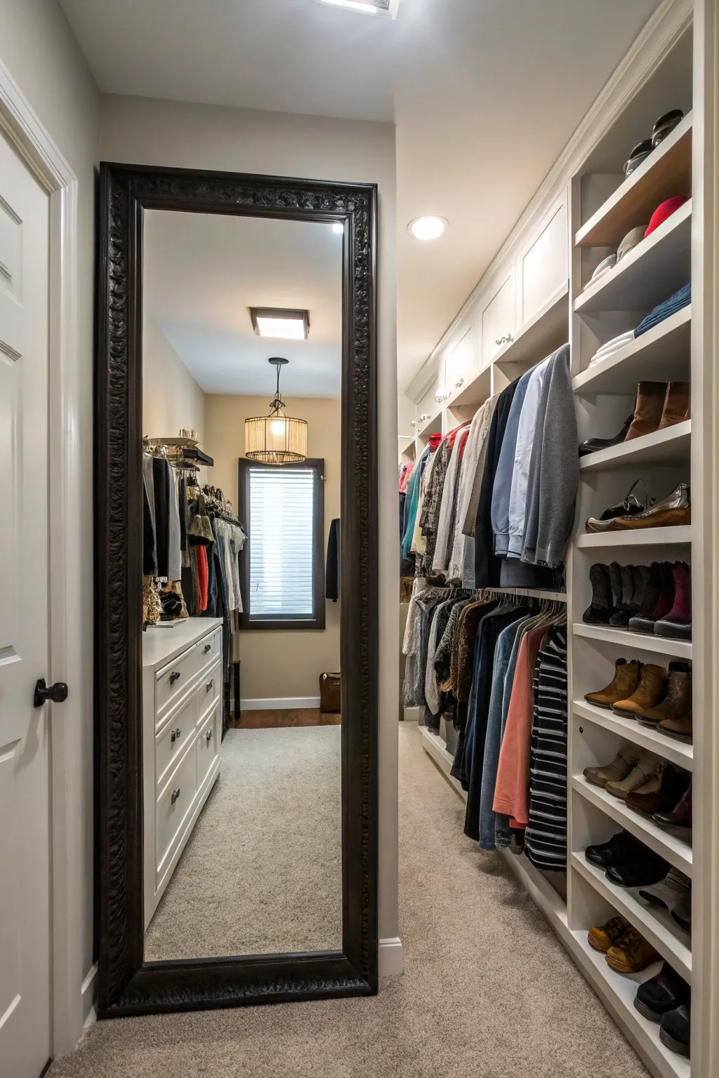 A full-length mirror not only has its intended function but also makes the closet seem bigger. I’ve noticed it’s especially helpful in tight spots where a sense of depth is needed.