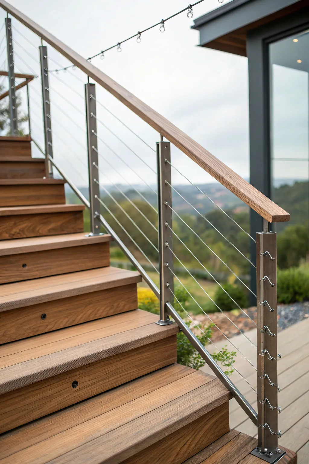 Cable wire guards offer a modern, industrial note to your deck stairs. I’ve realized they provide an unhindered view, perfect for showcasing my garden.