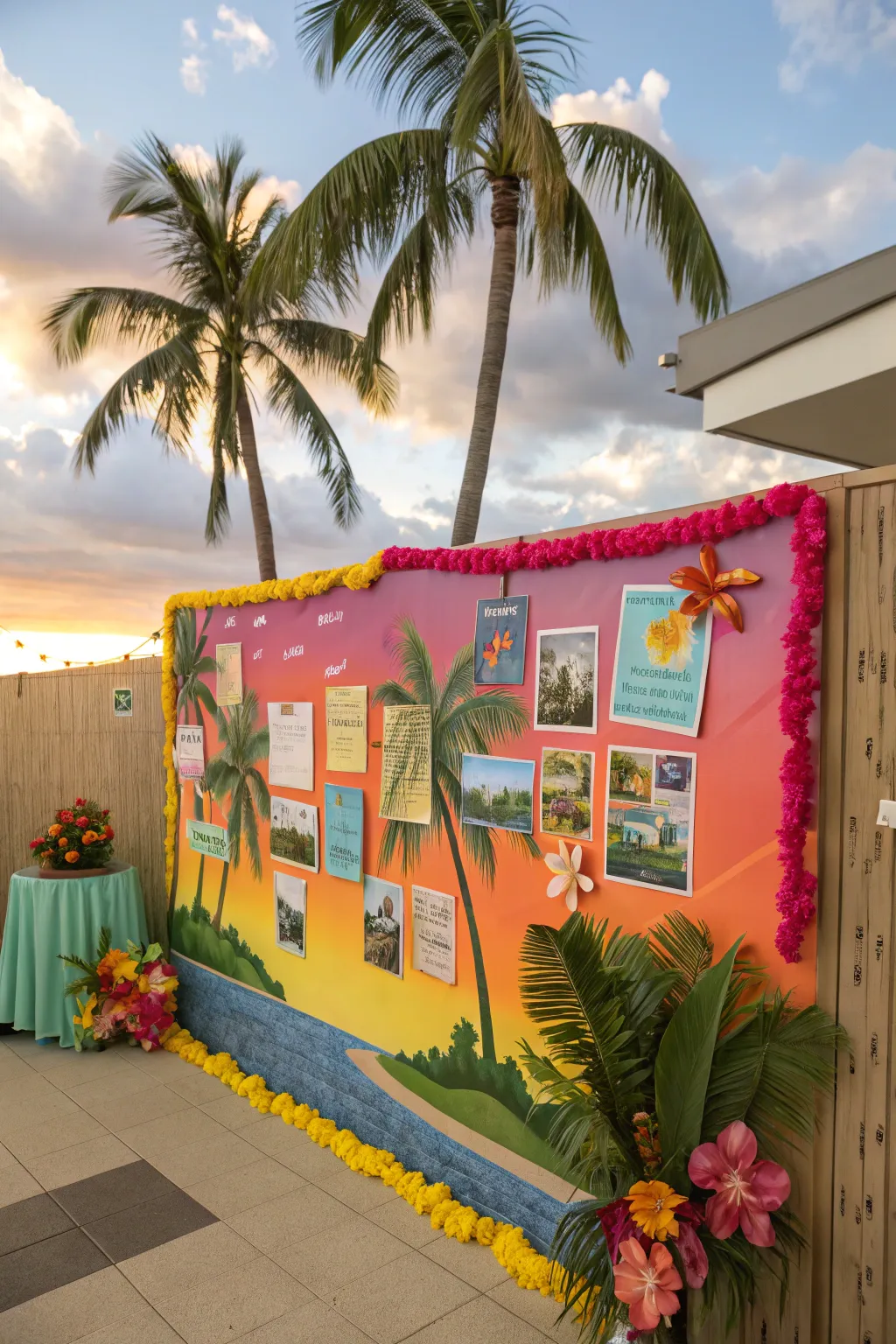 A tropical paradise bulletin board bursting with vibrant colors.