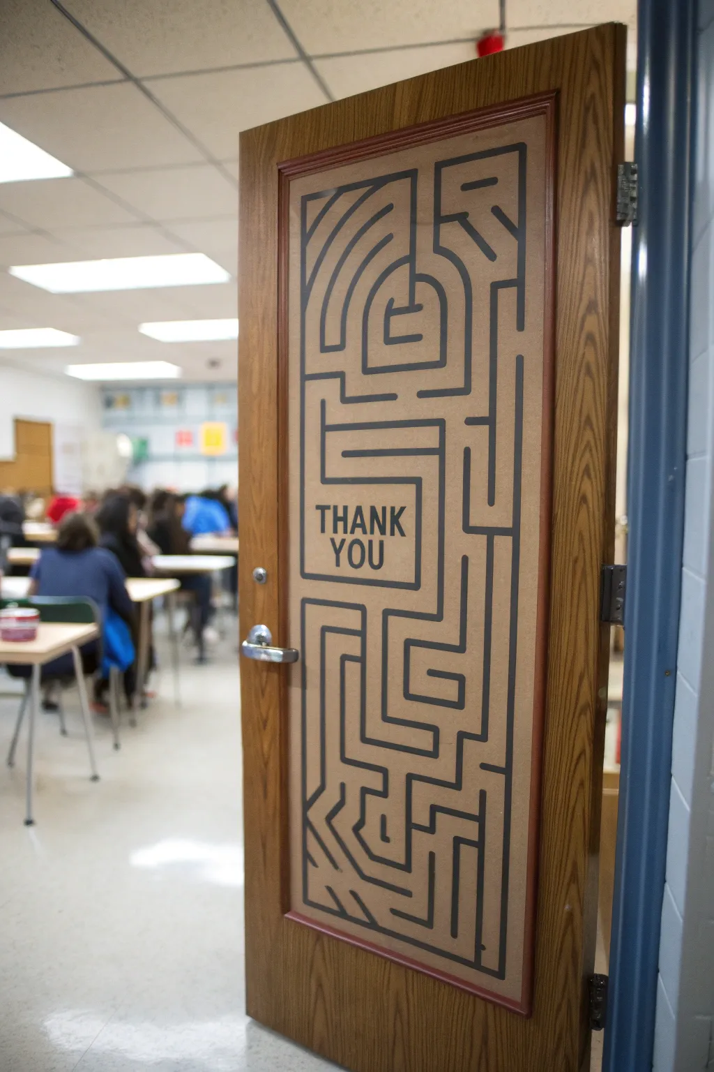 Construct an intriguing maze on the door, with a path that culminates in a ‘Thank You’ at its core. It’s a playful representation of the guidance teachers offer through the complex journey of learning.