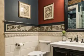 - Dark Geometric Wall Squares: Revamp your bathroom’s aesthetic through trendy dark geometric squares that deliver a modern, angular vibe.