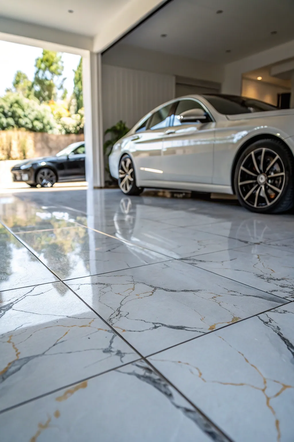 - High-Shine Porcelain Floor Squares: Enhance your garage’s sophistication with light-reflective high-shine porcelain squares for a spacious feel.