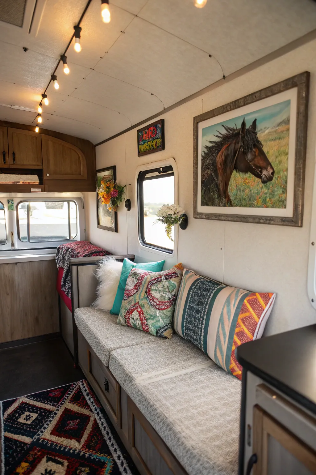 Bring coziness into your trailer using wood decor such as paneling or a small wooden bench. It brings charm and a warm, earth-tone feel.