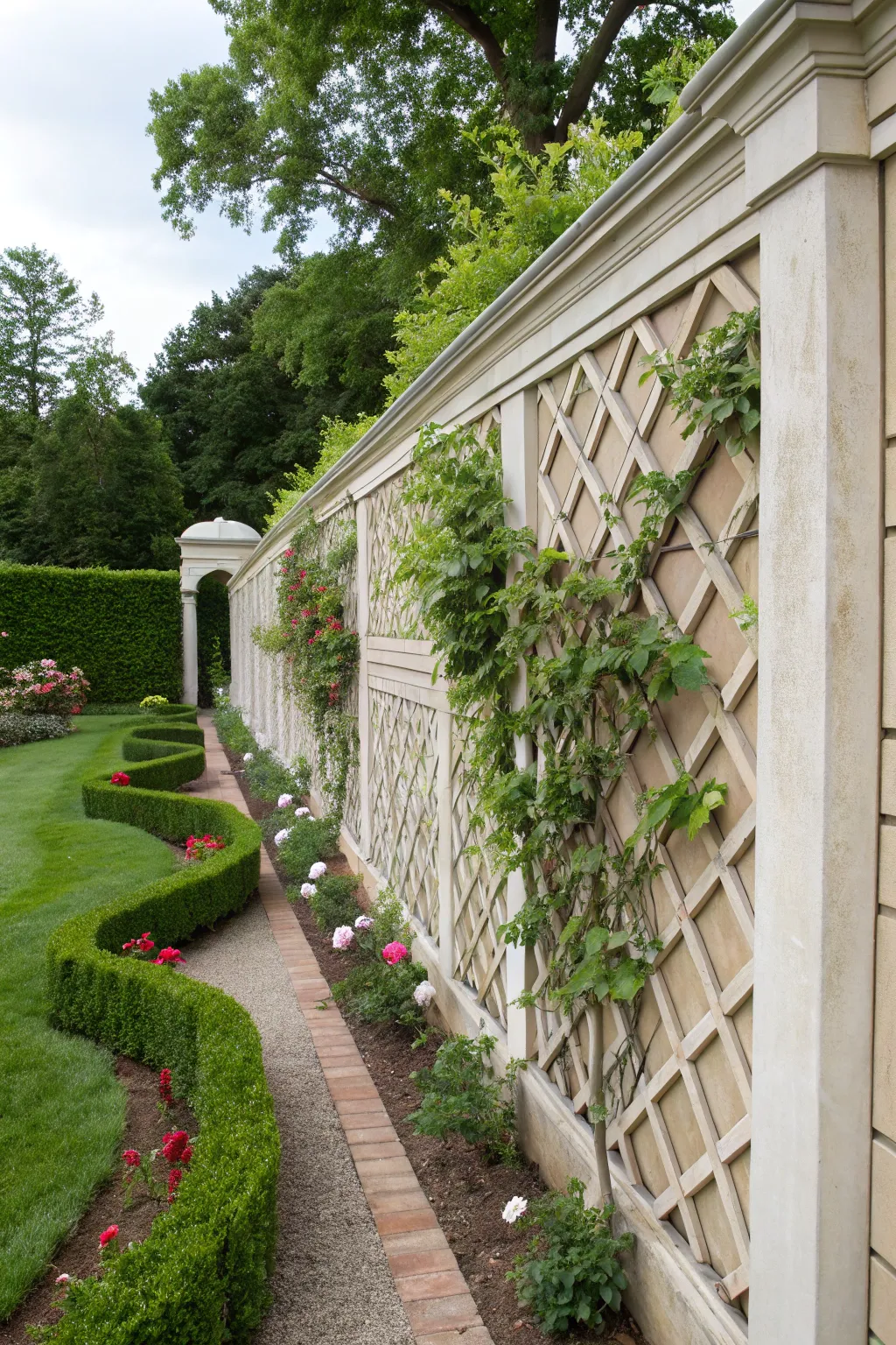 Trellises serve as a traditional means of aiding creeping flora, enriching any wall with innate beauty. In my personal garden, I’ve guided tendrils to ascend, turning a simple wall into a lively backdrop of green.