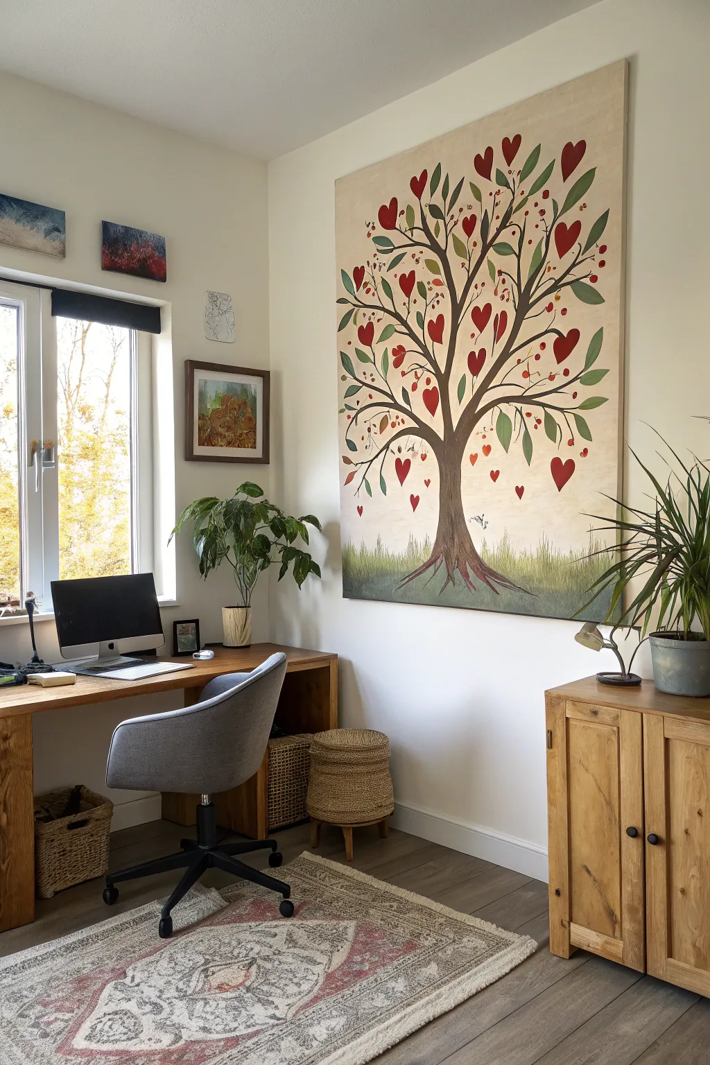 Render a tree bearing heart-formed leaves. It’s a cherished metaphor for development and affection which I hold dear in my concepts.