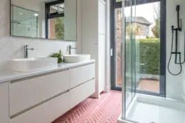 Floating shelves above the vanity offer extra storage while preserving floor space. I enjoy using them for displaying plants and decorative pieces, which contributes both function and flair.