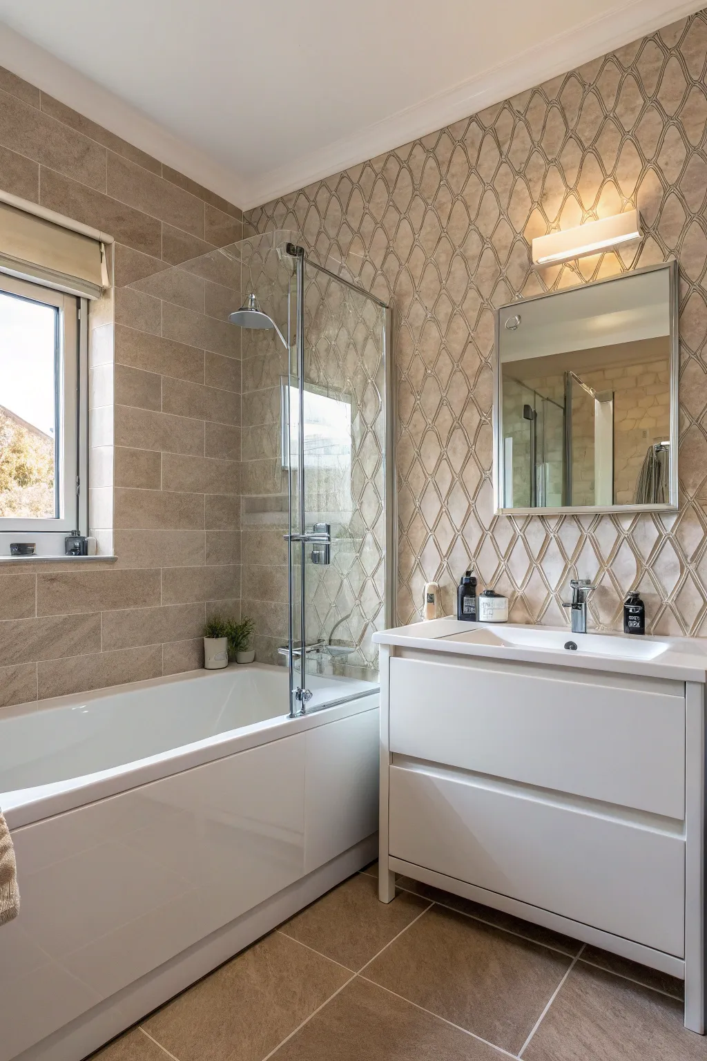 • Upright Pattern Wallcovering: Transform your bathroom with upright pattern wallcovering to make it feel taller and spacious.