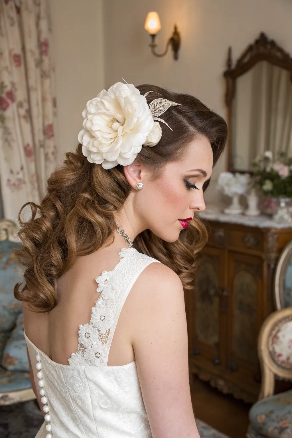 - Jumbo Floral Hair Accessories: Enhance your hairdo with charming jumbo floral clips, the perfect accent for a romantic and vintage bridal look.