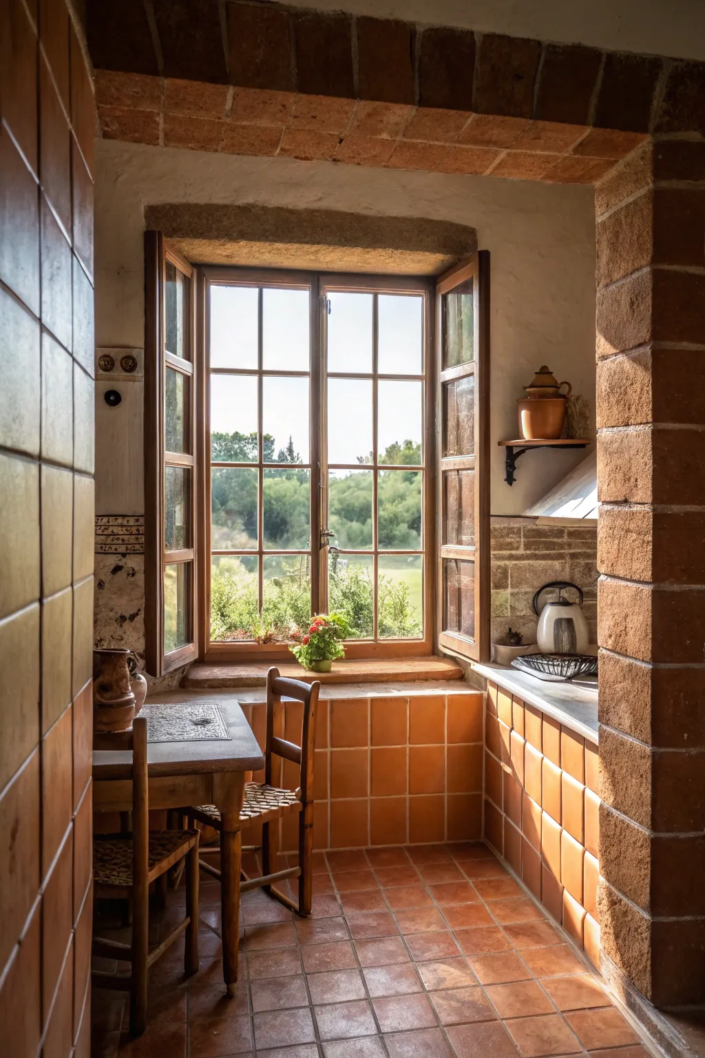 Bring in some Mediterranean warmth with baked clay tiles. I once helped a client create a rustic kitchen vibe with these tiles, surrounding their window to frame their view perfectly.